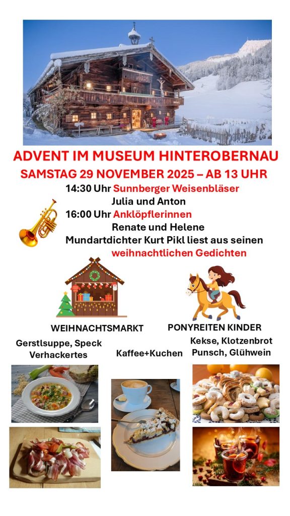 Der Nachmittag war ein krönender Abschluss einer sehr erfolgreichen Saison. Viele – sehr viele – begeisterte Besucherinnen und Besucher haben die Köstlichkeiten genossen, die unsere Helferinnen und Helfer liebevoll angeboten haben. Die wunderschönen Dekorationen und die „Adventstandl’n“ aber auch die musikalische Begleitung von Juli und Anton (Harfe und Ziehharmonika), den „Sunnberger Weisenbläsern“ und den beiden „U’klöpfler(innen)“ Renate und Helene, haben die Besucher auf die Weihnachtszeit eingestimmt.